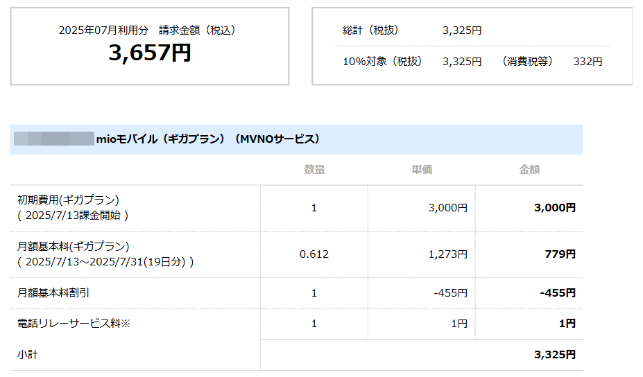 そして初期費用と月額料金。7月分は13日からの日割りになっている。契約は音声SIM(10G)で税込1,400円なのだが、とりあえず日割りなのと割引があるのとでこんな請求になっている。