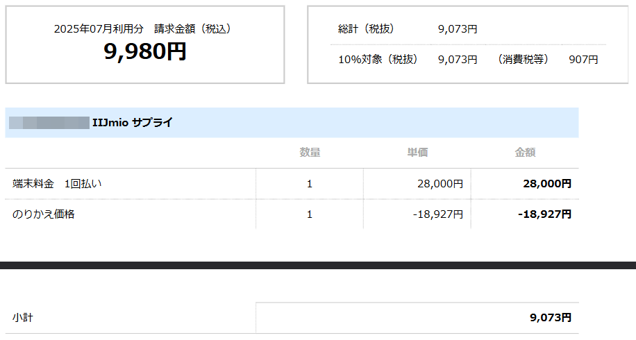 気になる導入後の1回目の支払い。まずは端末代金。キャンペーン内容どおりの9,980円だった。