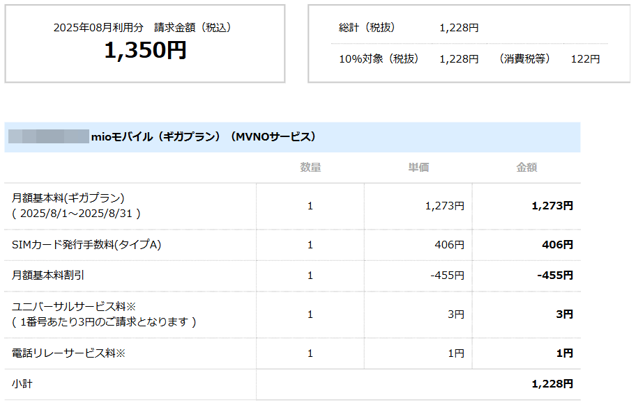 続いて8月分の請求。SIMカード発行手数料が加算されている。
